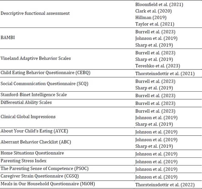 Among the most frequently mentioned instruments is BAMBI (Behavioral Assessment of Mealtime Behavior and Interaction), a tool highlighted with four mentions in recent studies (Burrell et al., 2023; Johnson et al., 2019; Muldoon & Cosbey, 2018; Sharp et al., 2019). The Clinical Global Impression (CGI-I) instrument/protocol was also identified with high frequency, being mentioned three times throughout the analyses (Burrell et al., 2023; Johnson et al., 2019; Sharp et al., 2019). BAMBI is an instrument designed to assess challenging behaviors during meals in children with ASD in order to identify patterns of food selectivity and food refusal behaviors. The original validation study of the instrument involved the analysis of internal consistency and test-retest reliability, showing high levels of reliability and validity. Subsequent studies, such as that conducted by Meral and Fidan (2014), also confirmed the psychometric quality of BAMBI, including internal consistency (Cronbach's alpha) and test-retest reliability. More recently, a validation study of the Italian version of BAMBI showed similar results, reinforcing its clinical and research applicability in different populations and cultural contexts (Berardi et al., 2023).