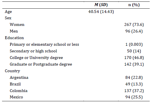 The data analyzed in this paper corresponds to the complete data survey of Latin America iCARE study participants from March 27, 2020 to June 15, 2021. This study was launched in March 2020 using convenience snowball sampling (globally) and parallel representative sampling in targeted countries. The study is led by the Montreal Behavioural Medicine Centre (MBMC: www.mbmc-cmcm.ca) in collaboration with a team of 200 international collaborators from 42 countries. The sample analyzed included 363 adult participants. The mean age of the participants was 40.54 years (SD = 14.43). The majority were women (73.6 %) and had a college or university degree (46.1 %), as shown in Table 1.