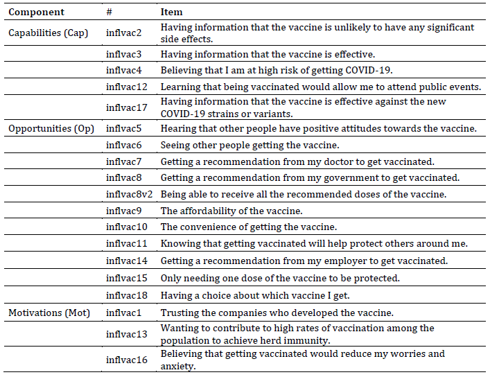 Vaccine acceptance, hesitancy and uptake can be understood through different lenses such as contextual, individual and vaccine specific (Ramonfaur et al., 2024). This study aimed to shed light on the social, environmental, and individual variables that influence the likelihood of getting a COVID-19 vaccine in a sample from Latin America to learn which variables are important to promote vaccination in future pandemics. These analyses reveal how the items were grouped according to the COM-B model, and they indicate that capabilities and opportunities are not crucial in vaccination uptake. However, it is important to understand that having the opportunity to have access to vaccines is the first step in a new pandemic. However, when you need to generate the motivation to increase the uptake of the vaccine, knowing that getting vaccinated will help protect others, that it will contribute to reaching high vaccination rates among the population to, in turn, achieve herd immunity, and believing that it will reduce individuals’ worries and anxiety, are better predictors of the likelihood of getting vaccinated than capabilities and opportunities.