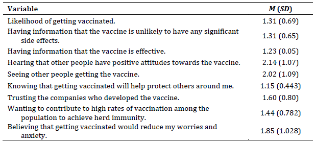In pursuing a more profound understanding of these results, the descriptive statistics of the items included in the model and the probability of being vaccinated are presented in Table 3. Overall, the likelihood of getting vaccinated was relatively low (M = 1.31, SD = 0.69, range = 1–4). Among the motivational factors, hearing that other people have positive attitudes toward the vaccine (M = 2.14, SD = 1.07) and seeing others getting vaccinated (M = 2.02, SD = 1.09) were rated higher than most other items, suggesting that social influence may play an important role in shaping vaccination intentions. In contrast, capability-related items such as having information about vaccine effectiveness (M = 1.23, SD = 0.05) or knowing that vaccination helps protect others (M = 1.15, SD = 0.44) received the lowest scores, indicating limited confidence in informational or altruistic drivers. Opportunity-related items, such as trust in the companies that developed the vaccine (M = 1.60, SD = 0.80) and believing that vaccination would reduce worries and anxiety (M = 1.85, SD = 1.03), fell in the mid-range.