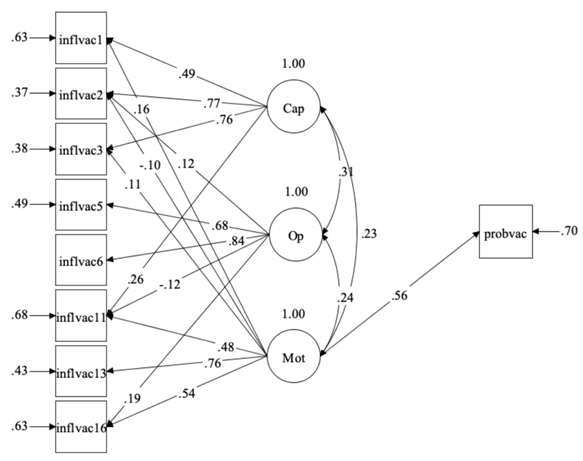 Notes: N = 368; Estimator: MLR; Rotation: CF-Varimax (oblique); Factor variances fixed to 1 as a default in the ESEM approach. All parameters were significant at the p <.01 level, except for p -> inflvac1, inflvac2 and Mot -> inflvac1, inflvac2, and inflvac3 significant at the p < .05.