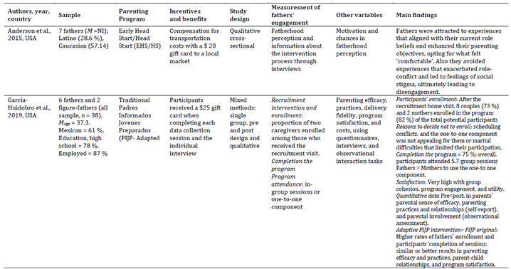 The studies reviewed were conducted in three countries. Of the 11 studies, eight were carried out in the United States (73 %), two in Australia (19 %), and one in Sweden (8 %). Sample sizes ranged from 6 to 906 fathers (M = 201.20), with an average age of 33.91 years. The study with the largest sample was conducted by Tully et al. (2019) in Australia, while the smallest was by Garcia-Huidobro et al. (2019) in the United States. Regarding participant characteristics, five studies targeted populations with specific profiles: low-income fathers (Hayward et al., 2020), Latino families (Garcia-Huidobro et al., 2019), African American fathers (Kohl & Seay, 2015), individuals experiencing social vulnerability (Anderson et al., 2015; Rostad et al., 2017), and those referred by judicial programs (Rodriguez & Choque, 2022). In the remaining studies, no participation restrictions were applied. Concerning incentives and compensation, six of the 11 studies offered transportation or meal vouchers ranging from $ 25 to $ 50 (Anderson et al., 2015; Garcia-Huidobro et al., 2019; Hayward et al., 2020; Julion et al., 2021; Randles, 2020; Seymour et al., 2021).