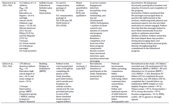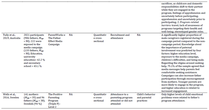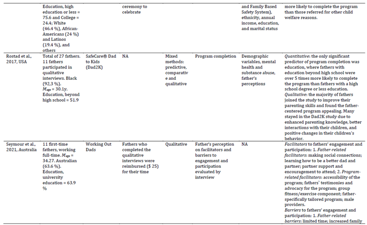 Three studies investigated variables associated with paternal engagement in the following parenting intervention programs: Dad2K (Rostad et al., 2017), Triple P – Level 2 (Wells et al., 2016), and FOCUS for Fathers (Rodriguez & Choque, 2022). Factors influencing the completion of a child maltreatment prevention program developed for male caregivers were examined, showing that fathers’ education level was the only significant predictor of program completion (Rostad et al., 2017). Fathers with education beyond high school were more than five times as likely to complete the program as those with a high school degree or less. The qualitative analysis revealed that, when asked about their motivations to participate in the intervention, most fathers expressed a desire either to enhance their existing parenting practices or to acquire new ones. They also found participation in a father-focused parenting program particularly appealing. Regarding the factors that encouraged fathers to remain engaged in the program, many cited the expansion of their parenting knowledge, improved interactions with their children, and observed positive changes in their children’s behavior as key reasons for continued participation.