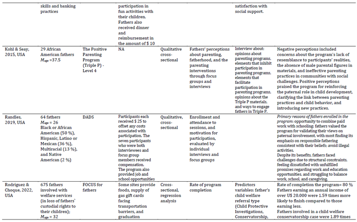 Four studies, through interviews, evaluated fathers’ perceptions of engagement and interest in parenting programs. Randles (2020) investigated how fathers’ perceptions of fatherhood influenced their engagement in the parenting guidance program (DADS). Notably, in addition to parenting training, the program offered courses and educational opportunities for fathers, as well as assistance with job searching and professional development, enabling participants to improve their financial conditions. As a result, most fathers identified these factors as the main reasons for their participation and engagement in the program. Another aspect mentioned was the validation provided by professionals, who acknowledged fathers’ efforts and positive behaviors in fatherhood. The program reinforced the importance of both financial and emotional support, helping fathers redefine their roles to include presence and care. Fathers valued the program’s ability to provide stable employment, social support, and practical resources, all of which were essential for sustaining their involvement with their children. These findings highlight the importance of comprehensive support for fathers, particularly those facing socioeconomic challenges, to help them fulfill their roles as responsible and engaged parents.