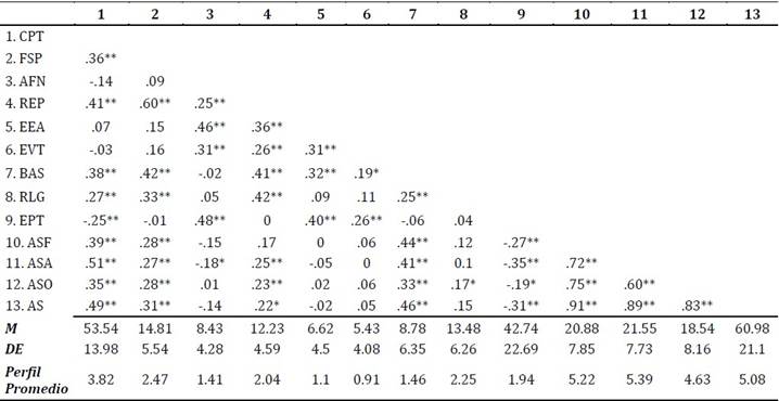 El nivel de las variables de estudio se determinó con base en el perfil promedio (con fines orientativos), calculado mediante la media aritmética entre el número de preguntas de cada cuestionario. De esta manera, mayores puntuaciones reflejan en los participantes un mayor grado de CPT, estrategias de afrontamiento, sintomatología de EPT y apoyo social en relación con las categorías de respuesta de cada instrumento.