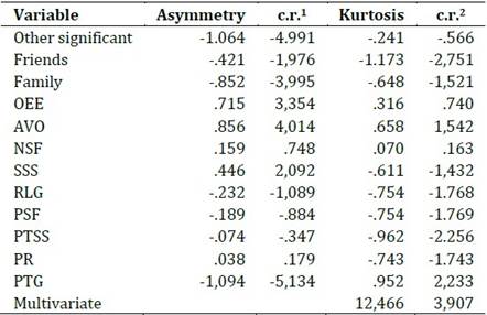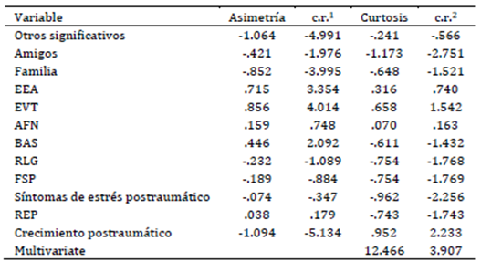 Dicho modelo propone como variables independientes al apoyo social de la familia, amigos y otras personas significativas, así como a las estrategias de afrontamiento de EEA, AFN y EVT, las cuales tienen un efecto directo hacia la sintomatología de estrés postraumático. De igual manera, como variables mediadoras hacia el CPT se proponen a las estrategias de REP, BAS, RLG, FSP y los síntomas de estrés postraumático. Considerando las variables del Modelo hipotético, se analizó la normalidad de los datos, evidenciado falta de normalidad (Tabla 2), por lo cual el cálculo se llevó a cabo con el método de bootstrap.