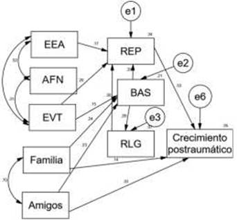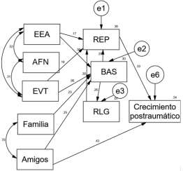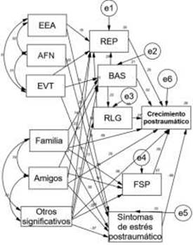 Al identificar los predictores del CPT, el modelo resultante presentó tres vías principales: (1) a través del apoyo de los amigos, (2) por el efecto indirecto del apoyo de la familia y amigos a través de BAS, RLG y REP, y (3) las estrategias de afrontamiento de EEA, EVT y AFN a través de la REP.