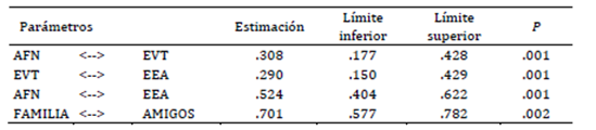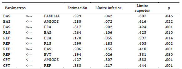 En cuanto a los efectos indirectos de apoyo de la familia (β = .028; p = .020), apoyo de los amigos (β = .030; p = .033), EEA (β = .095; p = .001), EVT (β = .065; p = .032), BAS (β = .122; p = .001) y RLG (β = .100; p = .001) sobre el CPT, estos efectos resultaron significativos pero bajos (p < .05).