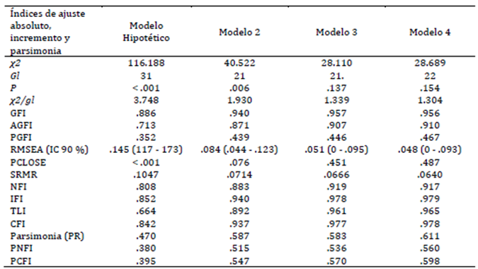 Un buen ajuste se considera cuando: χ²/gl es menor o igual a 2, GFI, NFI y CFI son mayores o iguales a .95, AGFI es mayor o igual a .90, y SRMR y RMSEA son menores o iguales a .05. Un ajuste aceptable se da cuando: χ²/gl es menor o igual a 3, GFI, NFI, CFI y RFI son mayores o iguales a .90, AGFI es mayor o igual a .85, y SRMR y RMSEA son menores o iguales a .08 (Arbuckle, 2013; Byrne, 2016).