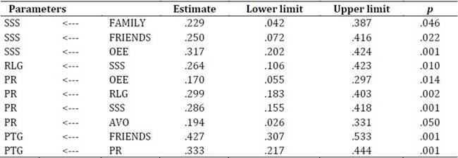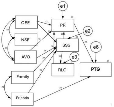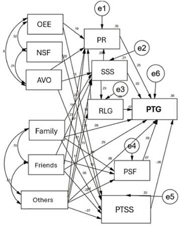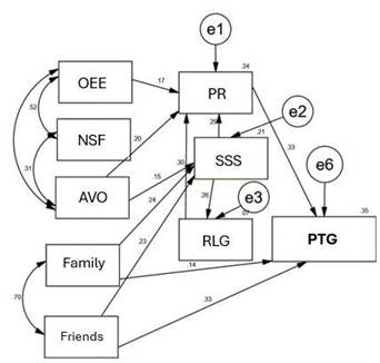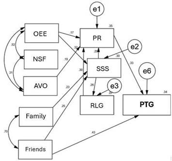 Regarding the indirect effects of family support (β = .028; p = .020), friend support (β = .030; p = .033), OEE (β = .095; p = .001), AVO (β = .065; p = .032), SSS (β = .122; p = .001), and RLG (β = .100; p = .001) on PTG, these effects were significant but low (p < .05).
