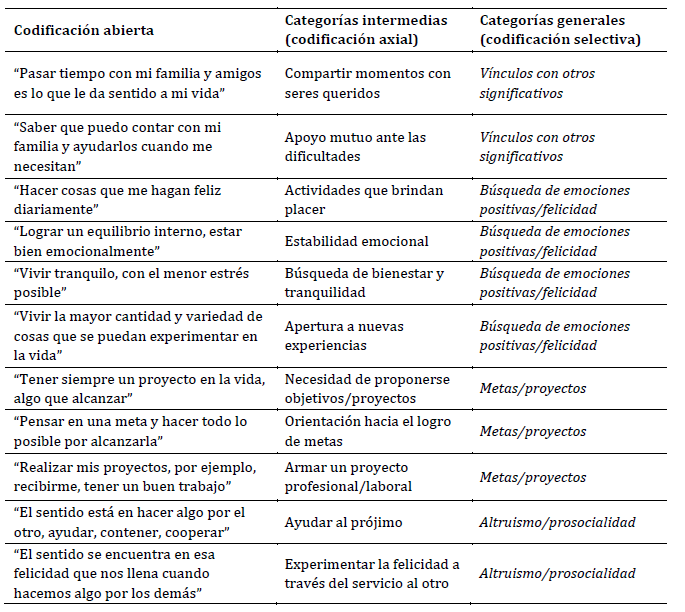 En la Tabla 2 se exponen las frecuencias absolutas y distribuciones porcentuales obtenidas para cada una de las categorías generales identificadas. Como se observa, Vínculos con otros significativos fue la categoría más frecuente, seguida de Búsqueda de emociones positivas/felicidad.