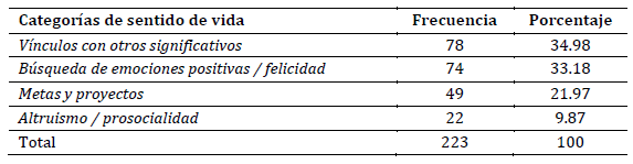 Tabla 2: Frecuencias y porcentajes de las categorías de sentido de vida