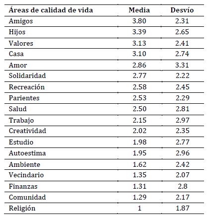 Tabla 3: Medias y desvíos de las áreas de calidad de vida