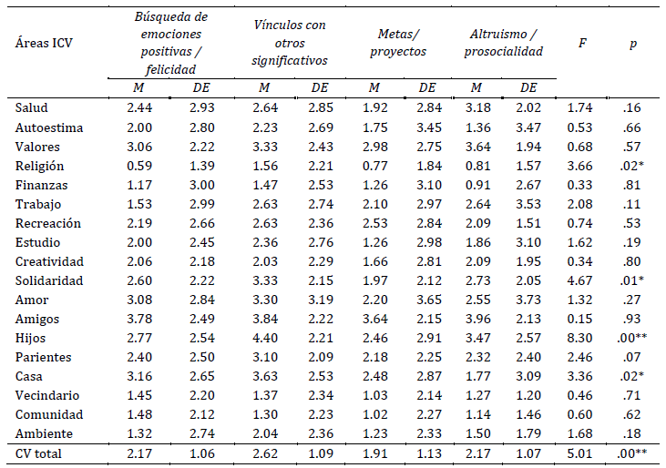 En función del tercer objetivo del estudio, se analizó la existencia de diferencias significativas en la CV percibida según categorías de significados de SV señaladas. Como se observa en la Tabla 4, se hallaron diferencias significativas en la CV total percibida en favor de los participantes de la categoría Vínculos con otros significativos, en comparación con los de Búsqueda de emociones positivas/felicidad y Metas/proyectos (F(3, 83.3) = 5.01, p = .00). En particular, los participantes de la categoría Vínculos con otros significativos perciben significativamente mayor satisfacción en las áreas de CV correspondientes a religión, solidaridad, hijos y casa.