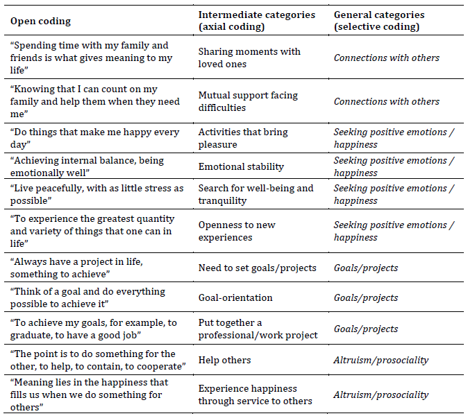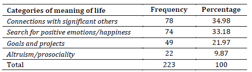 Table 2 presents the absolute frequencies and percentage distributions obtained for each of the identified general categories. As shown in Table 2, Connections with significant others was the most frequent category, followed by Seeking positive emotions/ happiness.