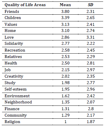 Regarding the description of the sample's QOL, the areas with the highest scores in terms of importance-weighted satisfaction were: Friends, followed by Children, Values, and Home. The areas with the lowest levels of satisfaction were Neighborhood, Finance, Community, and finally, Religion (Table 3). These domains negatively impact the participants' overall quality of life.
