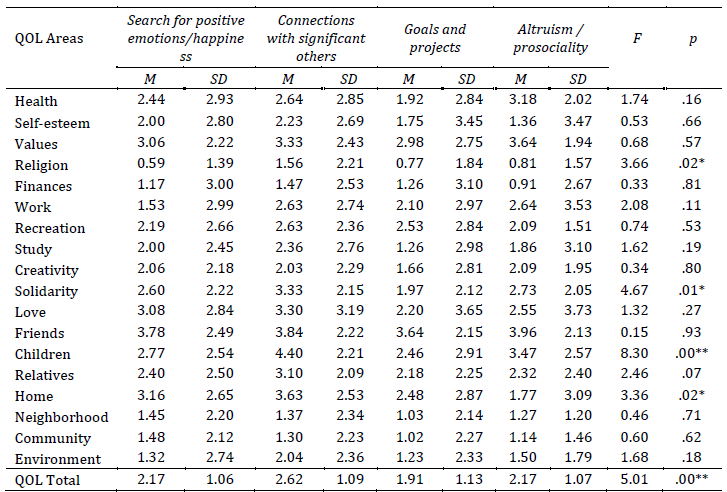 Table 4: Differences in perceived quality of life according to categories of meanings associated with the sense of life