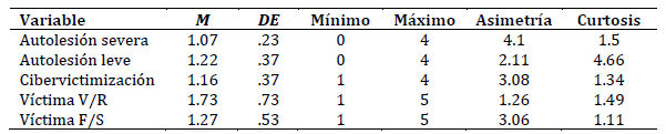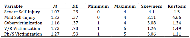 Primeramente, se muestran los análisis descriptivos de las variables de estudio en términos de media (M), desviación estándar (DE), mínimo, máximo, así como asimetría y curtosis. Es importante considerar que, según lo planteado por Kim (2013), las variables son tendientes a la normalidad, pues su asimetría y curtosis no sobrepasa el ± 7 (Tabla 1).