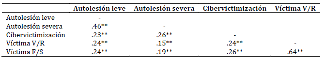 Posteriormente, se realizaron correlaciones entre las variables de estudio (Tabla 2). Los análisis de correlación evidenciaron asociaciones positivas y estadísticamente significativas entre todas las variables examinadas. Destacó la correlación moderada entre autolesión leve y severa (r = .46; p < .01), así como las asociaciones más débiles, aunque consistentes, entre cibervictimización y autolesión leve (r = .23; p < .01) y severa (r = .26; p < .01). La victimización física/social mostró la correlación más elevada con victimización verbal/relacional (r = .64; p < .01), lo que sugiere una superposición entre estas formas de agresión.