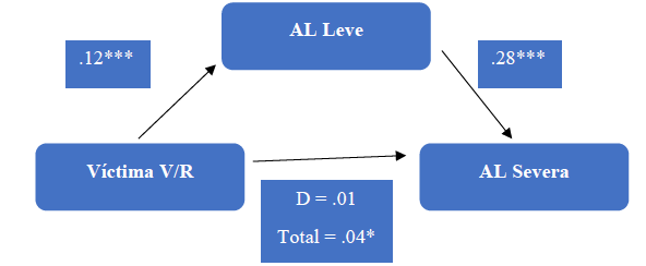 Figura 3: Modelo de mediación para las variables víctima V/R, autolesión leve y autolesión severa