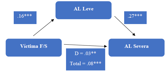 Figura 4: Modelo de mediación para las variables víctima F/S, autolesión leve y autolesión severa