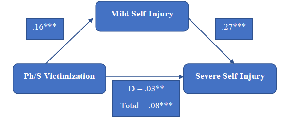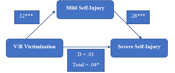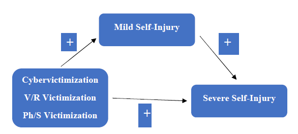 Furthermore, the finding that mild self-injury mediates the relationship between victimization and severe self-injury provides empirical support for the notion that self-injurious behaviors may occur in a stepped, progressive, and functionally differentiated manner.