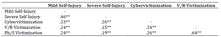 Subsequently, correlation analyses were conducted among the study variables (Table 2). The correlation analyses revealed positive and statistically significant associations among all variables examined. A moderate correlation was observed between mild and severe self-injury (r = .46, p < .01), as well as weaker but consistent associations between cybervictimization and mild self-injury (r = .23, p < .01) and severe self-injury (r = .26, p < .01). Physical/social victimization showed the strongest correlation with verbal/relational victimization (r = .64, p < .01), suggesting an overlap between these forms of aggression.