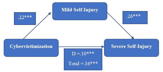 Figure 2: Mediation model for cybervictimization, mild self-injury, and severe self-injury