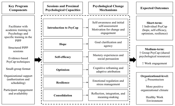 The PIPP aims to promote and develop the PsyCap of health professionals in public and private organizations by enhancing self-efficacy, optimism, hope, and resilience. Furthermore, the program was designed with a structure that includes: (1) three distinct points of effectiveness evaluation, (2) cost–benefit analysis, including return on investment (ROI) and cost indicators such as presenteeism, and (3) a systematized methodology that ensures replicability across different contexts.