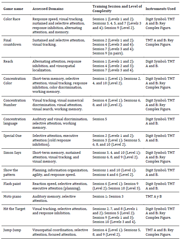 2. Central Training Phase: Duration 50 minutes, this phase involved the specific rotation of two to three games per session. Games were administered in individual or pair formats, with difficulty levels dynamically adjusted to ensure adaptive training progression. Each game targeted specific objectives of dual-task training (cognitive and motor), including the stimulation of sustained attention, working memory, and cognitive-motor processing speed.