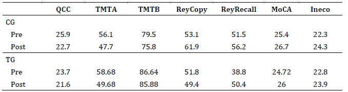 Note: CG: waitlist control group; TG=treatment group; QCC: Cognitive Change Complaint Questionnaire; TMTA and TMTB: Trail Making Test A and B; ReyCopy: Rey Complex Figure (copy); ReyRecall: Rey Complex Figure (recall); MoCA: Montreal Cognitive Assessment Test.