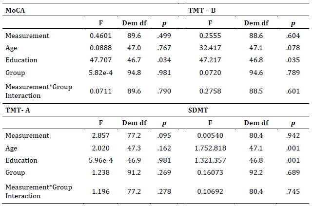 Note: MoCA: Montreal Cognitive Assessment Test; TMA A and B: Trail Making Test A and B; SDMT: Symbol Digit Modalities Test. *p <= .05