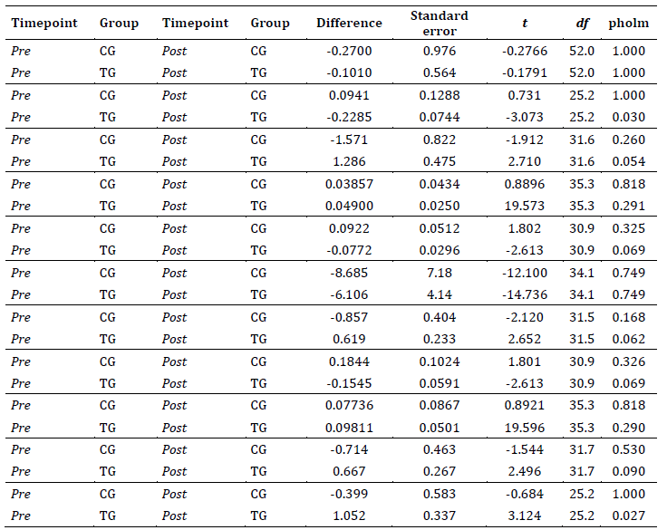 In contrast, the control group did not show significant differences between pre- and post-intervention measurements, which supports the hypothesis that the changes observed in the experimental group are attributable to the intervention.