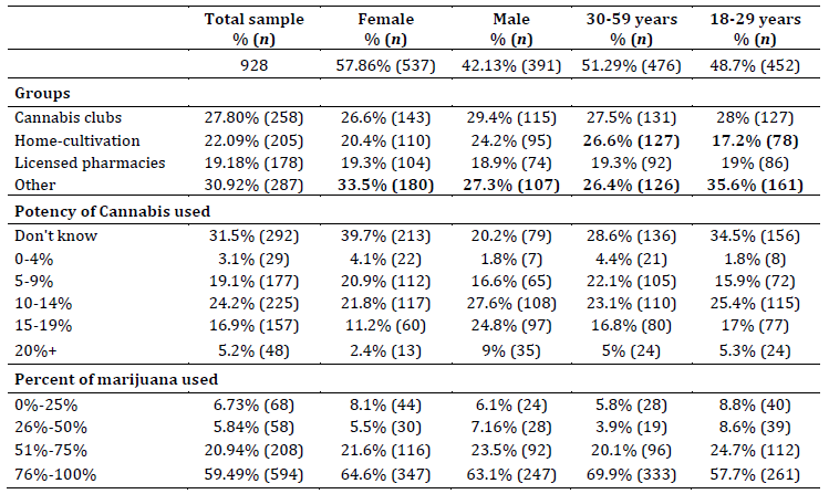 Note: Cells in bold indicate that the proportion of females endorsing “Other” sources was significantly greater than that of males (χ2 = 4.01, df = 1, p < .05, V = .05), that the proportion of participants aged 30-59 years endorsing home-cultivation was significantly greater than that of younger participants (χ2 = 11.96, df = 1, p < .001, V = .08), and that participants aged 18-29 years reported significantly greater endorsement of “other” sources”, compared to older participants (χ2 = 9.08, df = 1, p < .005, V = .07). THC: tetrahydrocannabinol.