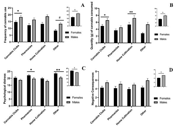 Note: Very few significant main effects of age group (18-29 or 30-59 years) were found, and age group did not significantly interact with the sex or source. Hence, the data is presented collapsed across age groups. The smaller bar graphs depict data across source and age groups. Frequency and quantity of use was significantly higher in males vs. females (indicated by the & sign) and significantly higher among club users compared to those getting cannabis from pharmacies or other sources (denoted by the * sign). Those participants accessing cannabis via other sources exhibited significantly less frequency of use than those relying on pharmacies or home cultivation (denoted by the # sign). Quantity of use was significantly higher in self-growers than in those getting cannabis at pharmacies or at other sources (denoted by the ** sign). Distress was significantly greater in female vs. males (denoted by the & sign), in younger vs. older participants (not shown) and was significantly greater in those endorsing "other" sources or buying cannabis at pharmacies than in those relying in clubs or home cultivation (denoted by the * and ** signs). Negative consequences were significantly higher in men (denoted by the & sign) and younger participants (not shown). Data is shown as mean ± SEM.