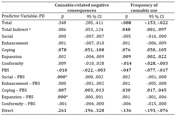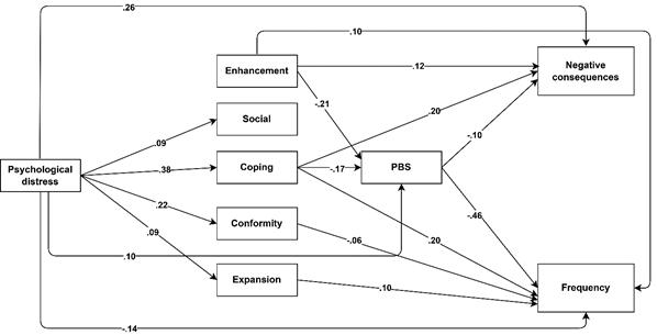 Frequency of cannabis use: Psychological distress was negatively directly associated with frequency of cannabis use, and also indirectly associated via coping, expansion and conformity motives, and via PBS. Individuals experiencing higher levels of psychological distress tended to report higher coping, conformity and expansion motives, which in turn were linked to changes in frequency of cannabis use. Additionally, a double mediation pathway was observed via coping motives and PBS. Those with greater psychological distress reported more coping motives, which were associated with a lower use of protective strategies, leading to higher frequency of cannabis use.
