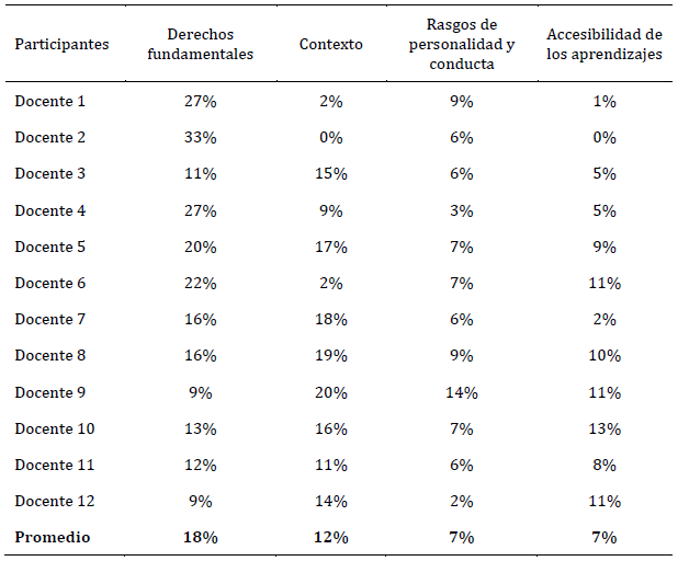 La Tabla 2 muestra los porcentajes de cobertura por cada participante de las categorías más presentes en su discurso. Cabe destacar que de esta cobertura dos categorías son emergentes. Las demás, propias del instrumento, no se evidencian en una presencia significativa, pues solo cubren en promedio un 3 % del discurso. Se podría inferir que la no evidencia de las categorías supone una percepción del sujeto con discapacidad como un ciudadano típico, al no puntualizar aspectos que clásicamente han sido asociados a la discapacidad, comprenden que su desempeño no está limitado por su discapacidad y asocian los apoyos a modelos ecológicos funcionales.