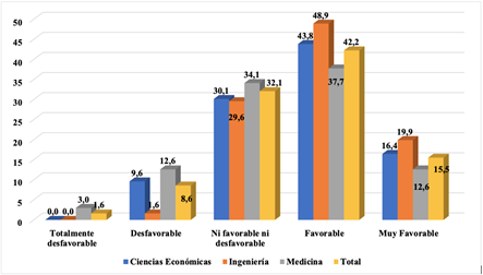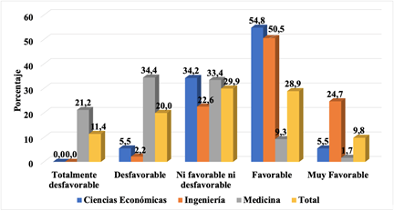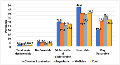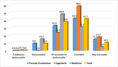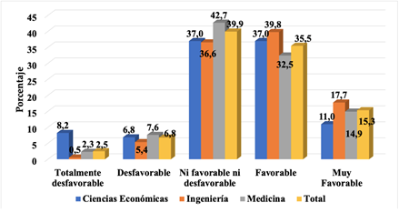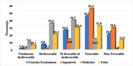 En general, la mitad de los estudiantes mostró una actitud global positiva. El 58.6 % de los estudiantes de Ingeniería tuvo una actitud global favorable, el 17.7 % muy favorable y el 23.7 % una actitud intermedia, ni favorable ni desfavorable. En contraste, en Medicina, un alto porcentaje de estudiantes mostró una actitud global intermedia, con un 48 %, solo el 31.1 % una actitud favorable y el 5 % muy favorable, y de las tres áreas de conocimiento es la que presenta el mayor número de estudiantes con una actitud desfavorable con un 15.2 %. Los estudiantes de Ciencias Económicas tuvieron en su mayoría actitudes positivas, con el 42.5 % en favorable y el 15.1 % en muy favorable, como se observa en la Figura 1.