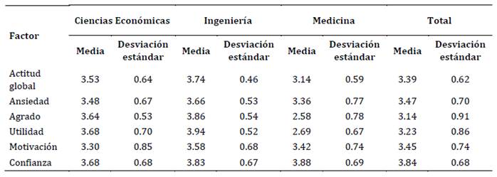 actitud en cinco factores: ansiedad, agrado, utilidad, motivación y confianza.