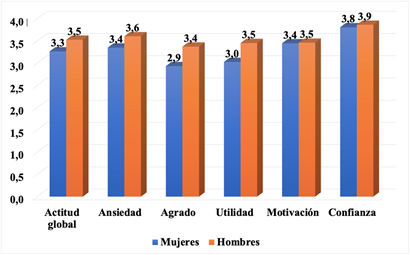 Se evidenció que los hombres tuvieron un promedio mayor en la actitud global y en cada uno de los factores del instrumento, especialmente en agrado y utilidad, como se muestra en la Figura 7.