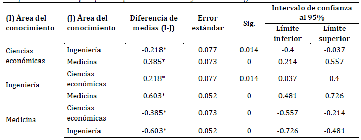 En el factor ansiedad la prueba post hoc HSD-Tukey mostró que la diferencia fue significativa entre Ingeniería y Medicina, no hubo diferencia entre los demás grupos. En agrado y utilidad fueron significativas todas las diferencias, de hecho, el promedio de los estudiantes de Ingeniería estuvo 0.3 puntos por encima de los de Ciencias Económicas y 1.3 puntos por encima de los de Medicina; a su vez, los de Ciencias Económicas estuvieron 1.0 punto por encima de los de Medicina. En el factor utilidad también fueron significativas todas las diferencias, se observa que el promedio de los estudiantes de Ingeniería estuvo 0.2 puntos por encima de los de Ciencias Económicas y 1.2 de los de Medicina; los de Ciencias Económicas estuvieron 1.0 punto por encima de los de Medicina. Finalmente, en el factor motivación la diferencia fue significativa entre Ingeniería y Ciencias Económicas.