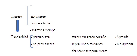 El esquema elaborado por Terigi (2007) permite dar cuenta de las trayectorias escolares y de sus posibles avatares, mostrando las opciones de permanencia y no permanencia, el avance en los grados o años de estudio y las posibilidades de aprendizaje. Este esquema se relaciona con la forma en que se consideran las trayectorias posibles, y la comparación entre las trayectorias esperadas con aquellas que efectivamente ocurren.