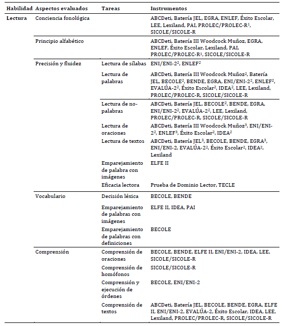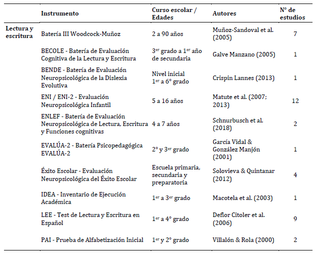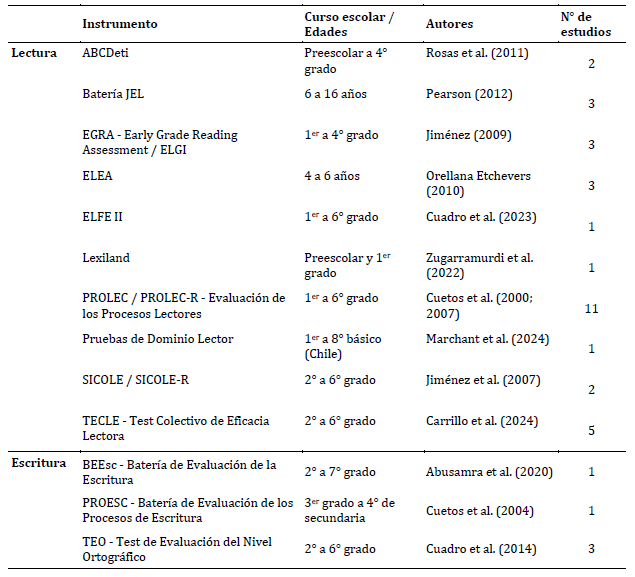 En la Tabla 2 se identifican los instrumentos revisados, que se presentan listados de acuerdo con la habilidad —lectura o escritura— que evalúan. Para cada instrumento, se consignan los autores y población destinataria según curso escolar o edad y, asimismo, se indica la cantidad de estudios localizados en la presente revisión que reportan su uso con población latinoamericana hispanohablante que asiste a 1ero, 2do y 3er grado de educación primaria.