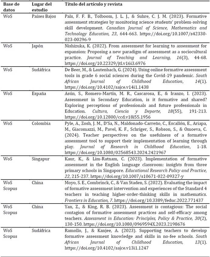 En particular, nos preocupa indagar sobre las estrategias de evaluación formativa que se desarrollan en el ámbito de la enseñanza básica y media del sistema escolar regular. Dado este interés, se presenta una revisión sistemática guiada por el protocolo PRISMA 2020 (Page et al., 2021), que incluye solo los artículos publicados en las bases de datos Web of Science (WoS) y Scopus. La búsqueda, realizada en enero de 2025, se centró en la frase clave “formative assessment strategies” en títulos, resúmenes y palabras clave, y se utilizaron operadores booleanos como “formative assessment AND strategies AND feedback AND teachers”. Se excluyeron artículos de revisión sistemática y aquellos centrados en niveles de educación parvularia y superior. Posteriormente, se aplicaron seis criterios de inclusión: 1) textos publicados en los últimos tres años, es decir, desde 2022 en adelante; (2) escritos en español o inglés; (3) artículos empíricos de revistas científicas; (4) el contexto de la investigación está situado en la educación escolar; (5) el área de investigación se vincula con ciencias sociales, educación e investigación educativa; (6) los temas estudiados están ligados a estrategias de evaluación formativa. Tras aplicar este protocolo, se seleccionaron 12 artículos de un total de 29, obtenidos de las bases de datos WoS y Scopus (ver Tabla 1).