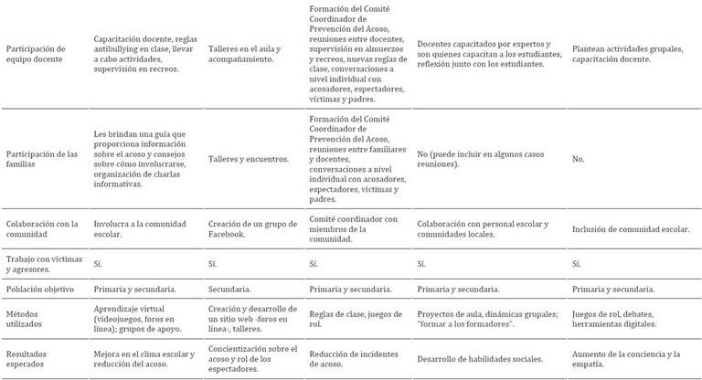 Al analizar los programas desde la clasificación en intervenciones primarias y secundarias, se observa que la mayoría responde a un enfoque primario, de carácter universal y preventivo, dirigido a toda la comunidad educativa. Estos programas no requieren la presencia explícita de situaciones de acoso para su implementación, sino que buscan prevenir su aparición. Por otro lado, específicamente el KiVa, y especialmente en OBPP, integran componentes primarios (como talleres o capacitación de docentes) y secundarios, que incluyen intervenciones específicas con estudiantes involucrados en situaciones de acoso, ya sea como víctimas, agresores o espectadores.