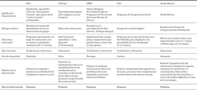 Se destaca que los cinco programas de intervención más frecuentes para la prevención del acoso escolar (en orden decreciente) son: Programa KiVA, NoTrap!, OBPP, ViSC y Media Heroes. A continuación, en la Tabla 1, se presenta una descripción de estos programas con sus características más relevantes.