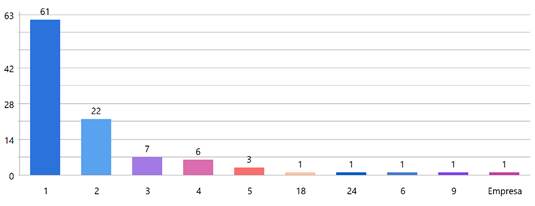 Excluindo aqueles municípios que não apresentaram dados sobre psicólogos escolares e educacionais, a maior parte (59 %, N = 62) possuía apenas um profissional correspondente aos critérios desta pesquisa. A Figura 1 mostra essa distribuição, constando no Eixo X o número de psicólogos, e no Eixo Y o número de municípios com determinada quantidade de psicólogos.