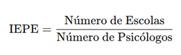Por fim, elaborou-se o Índice de Escolas por Psicólogo Escolar (IEPE), que representa a razão entre escolas da rede pública de ensino pelo quantitativo de psicólogos escolares e educacionais disponíveis. Esse índice nos ajuda a compreender quantas escolas estariam cobertas por cada profissional (Equação 4) e quanto menor esse índice, mais adequada a distribuição e a possibilidade de atuação efetiva. Na Bahia, os resultados revelam que cada psicólogo, em média, teria de atender aproximadamente 58 escolas públicas, considerando toda a rede, e aproximadamente 19 escolas, considerando apenas os municípios com psicólogos na educação básica pública.
