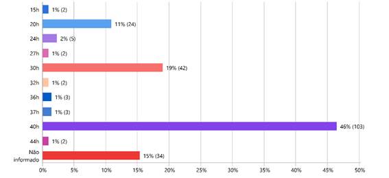 Quanto à carga horária de trabalho dos psicólogos escolares e educacionais na rede pública de educação pesquisada, os dados exibidos na Figura 4 sugerem um padrão de cumprimento de 40 horas semanais (46 %, N = 103). Há, ainda, 42 profissionais (19 %) trabalhando 30 horas semanais, carga horária de referência, pois tramita no Congresso Nacional o Projeto de Lei 1.214/2019, que visa estabelecer a jornada de trabalho de 30 horas semanais para psicólogos.