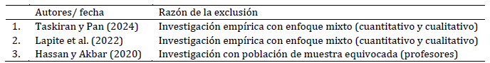 La Tabla 1 presenta el detalle de los estudios excluidos tras la lectura crítica, indicando de manera específica los motivos de exclusión. Estos trabajos fueron descartados principalmente por tres razones: emplear un enfoque mixto (cuantitativo y cualitativo), que no permitía aislar los resultados cuantitativos relevantes (Lapite et al., 2022; Taskiran & Pan, 2024), y por analizar una población no pertinente para los objetivos de la revisión, como docentes en lugar de estudiantes (Hassan & Akbar, 2020). Este registro asegura la transparencia del proceso de selección y permite la trazabilidad de las decisiones adoptadas.
